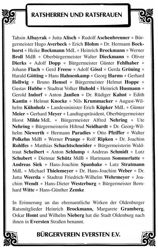 Die Beiträge in diesem Buch zur Heimat- und Vereinsgeschichte sowie zur guten kommunalen Entwicklung in Eversten sollten Veranlassung sein, die kommunalpolitisch seit 1946 tätig gewesenen und/oder noch aktiven Ratsmitglieder des Stadtwestens für ihr ehrenamtliches Engagement und für nachhaltige kommunale Entwicklungs- und Gestaltungserfolge auf Seite 46 öffentlich zu würdigen: