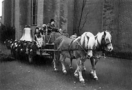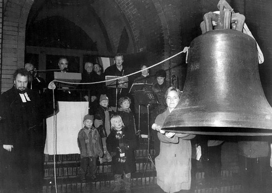 Durch Flucht und Vertreibung kamen viele Menschen in den Westen. Auch die große Glocke, die jetzt im Kirchturm hängt, hatte ihre Heimat verloren. Sie stammt aus Marklissa, Kreis Lauban, in Schlesien. Auf dem „Glockenfriedhof" in Hamburg hatte sie den Krieg überstanden. Seit 1945 tut sie in unserer Kirche ihren Dienst und sagt der Gemeinde, wenn sie allein läutet, daß ein Trauerzug über den Friedhof geht.