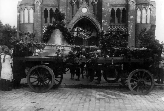 Die große Glocke unserer Kirche hat das Schicksal dieses Jahrhunderts durchgemacht: Die erste, von Franz Schilling gegossene, mußte zu Rüstungszwecken im Ersten Weltkrieg abgeliefert werden. Für sie wurde 1924 eine Ersatzglocke beschafft und geschmückt auf einem Pferdewagen zur Kirche gebracht. Aber dieser Glocke erging es im Zweiten Weltkrieg wie der ersten. Sie wurde im Frühjahr 1942 abgeholt.