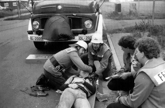 Die Ausbildung nimmt einen Großteil der Standortausbildung ein. Nicht nur der Umgang mit technischem Gerät, sondern auch die "Erste Hilfe" muß von den Mitgliedern der Feuerwehr beherrscht werden. Das Bild zeigt die Versorgung einer "verletzten" Person während einer Einsatzübung, die kontrolliert und bewertet wurde.